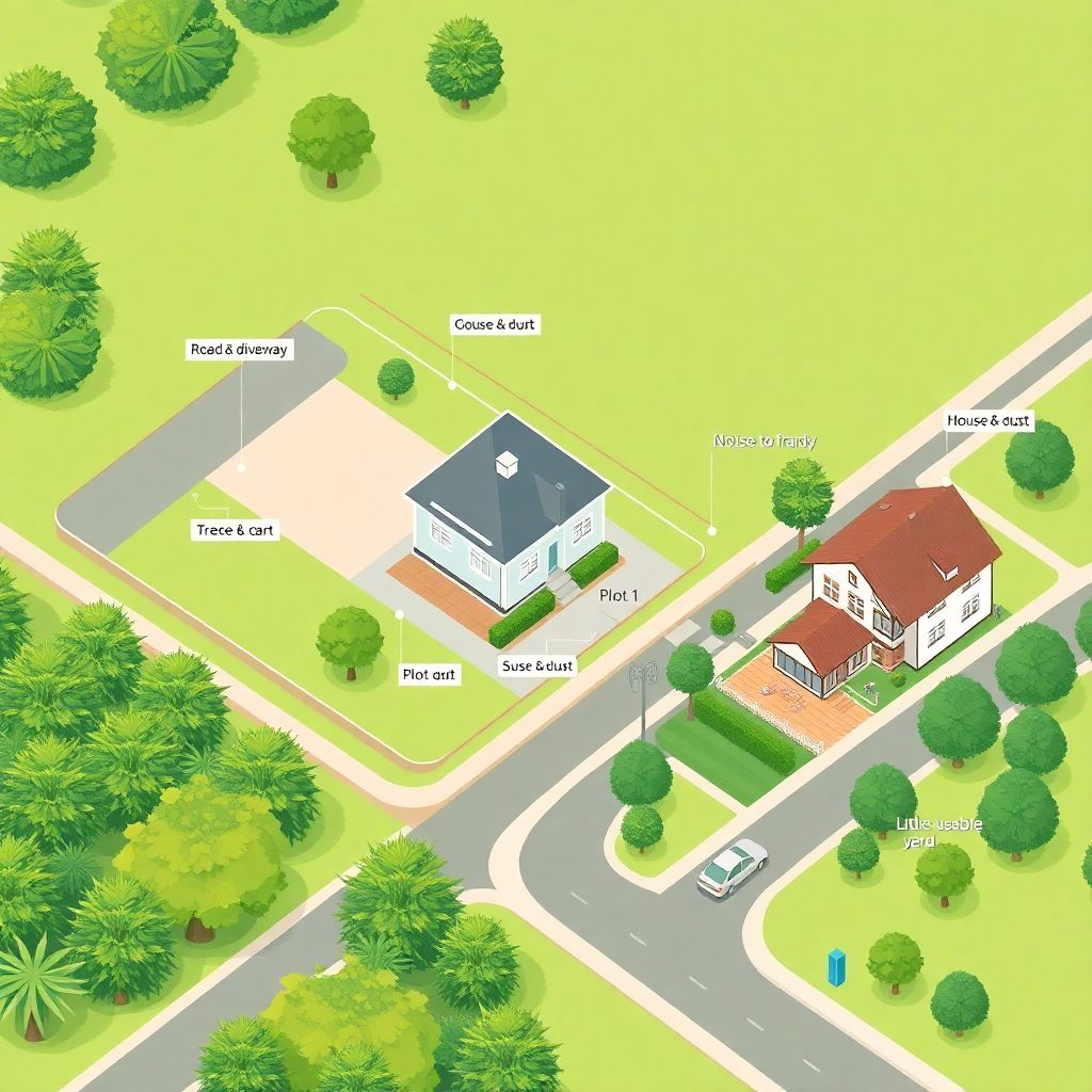 Когда осматриваете землю, полезно набросать себе маленькую текстовую диаграмму, чтобы потом трезво оценить планировку. Например: