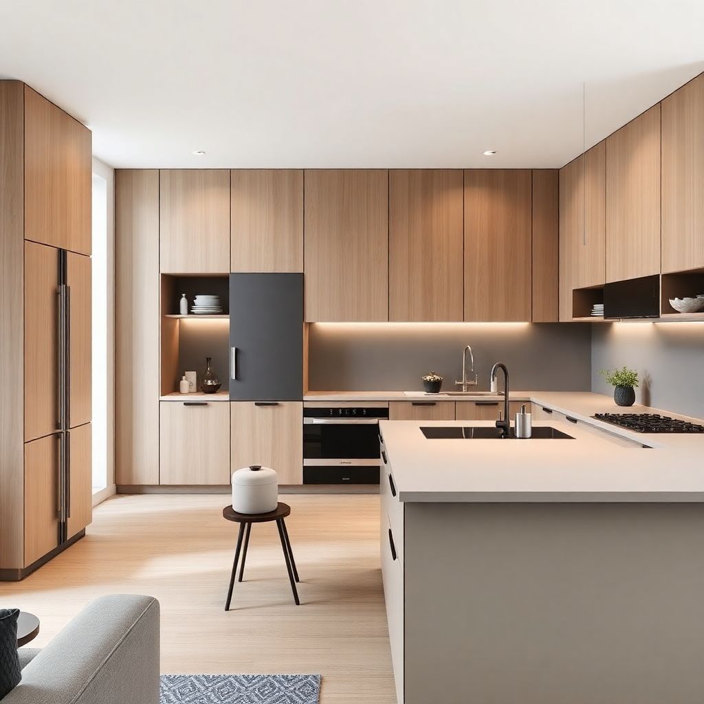 Глянцевые белые кухни уходят на второй план. В их место приходит тёплый минимализм: природные оттенки, спокойные текстуры, минимум «визуального шума».