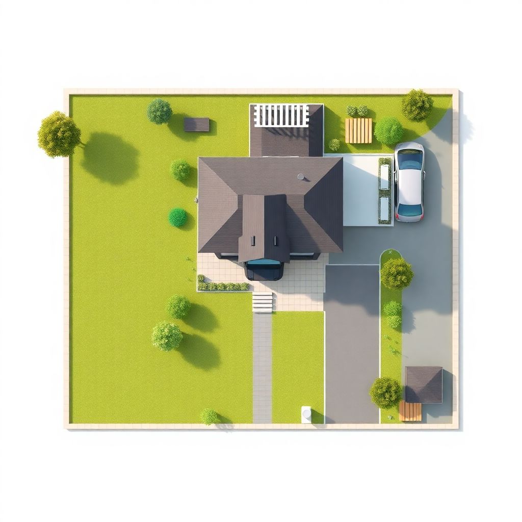 Представим типовой участок 20×30 м, въезд с узкой стороны. Практичный вариант: дом ставим ближе к улице, но не впритык — оставляем 5–6 м под парковку на 2 машины и разворот. Баню отводим в дальний угол, где можно сделать приватную зону с террасой и небольшим бассейном или купелью. Между домом и баней — дорожка из плитки, зимой по ней удобно ходить в тапках. Огород логично вынести на самый солнечный кусок, а детскую площадку — в зоне, видимой из кухни или гостиной.